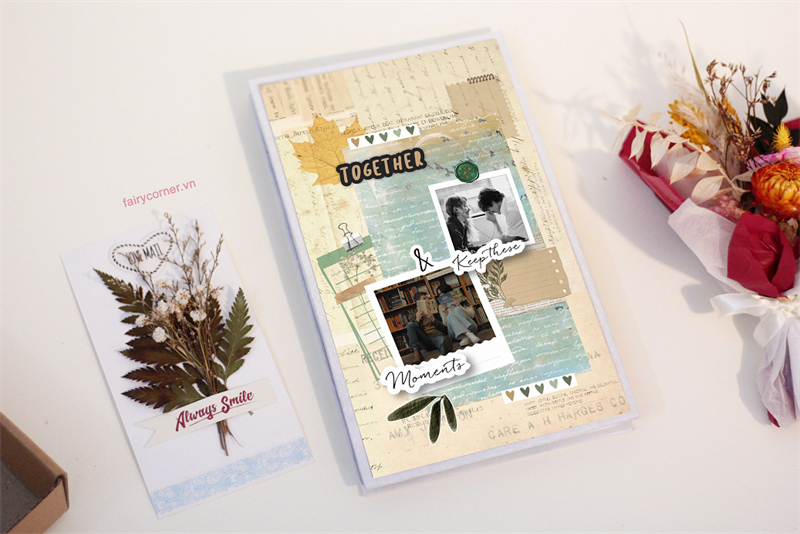 Phong cách Vintage hoài niệm: Sự kết hợp giữa tông màu trầm ấm của giấy Kraft, họa tiết lá phong và những mẩu giấy báo cũ tạo nên một vẻ đẹp bền bỉ với thời gian. Đây là lựa chọn hoàn hảo để lưu giữ hành trình yêu thương, kỷ niệm tình bạn hay những chuyến đi thanh xuân rực rỡ.