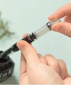 Khi bơm mực không cần tháo đầu bút, chỉ nhúng ngòi vào hũ mực và xoay đầu bút.